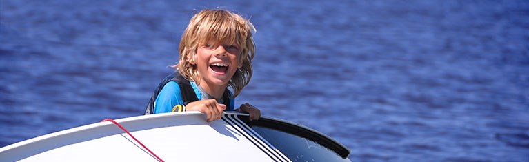 För barn upp till ca 14 år sker undervisningen i optimistjollar, en stadig jolle som är bra att lära sig segla i. Om du inte har en egen optimistjolle kan du låna båt på plats. Vi har både nybörjar- och fortsättningsgrupper.